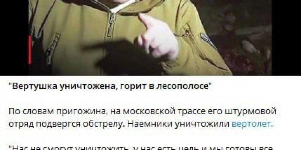 Правда: Информация о сбитом вертолете не подтверждена ничем, кроме слов самого Пригожина и одной фотографией с непонятным столбом дыма на горизонте, которую тиражируют украинские источники в удобном для себя ключе. Одним из первых данную новость распространил украинский блогер-фейкомет Шарий.