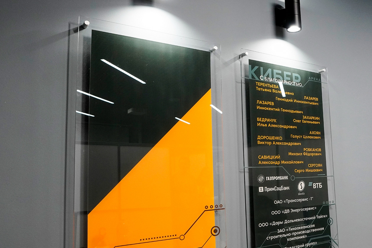 Кибер Арена — первый крупный проект ВВГУ, полностью реализованный на средства спонсоров. Вместе с представителями коллектива университета, меценатами проекта выступили известные в Приморье люди, а также крупные организации. Среди них “Славда”, ВТБ, Газпромбанк, Примсоцбанк, Фабрика мороженого и другие предприятия региона.