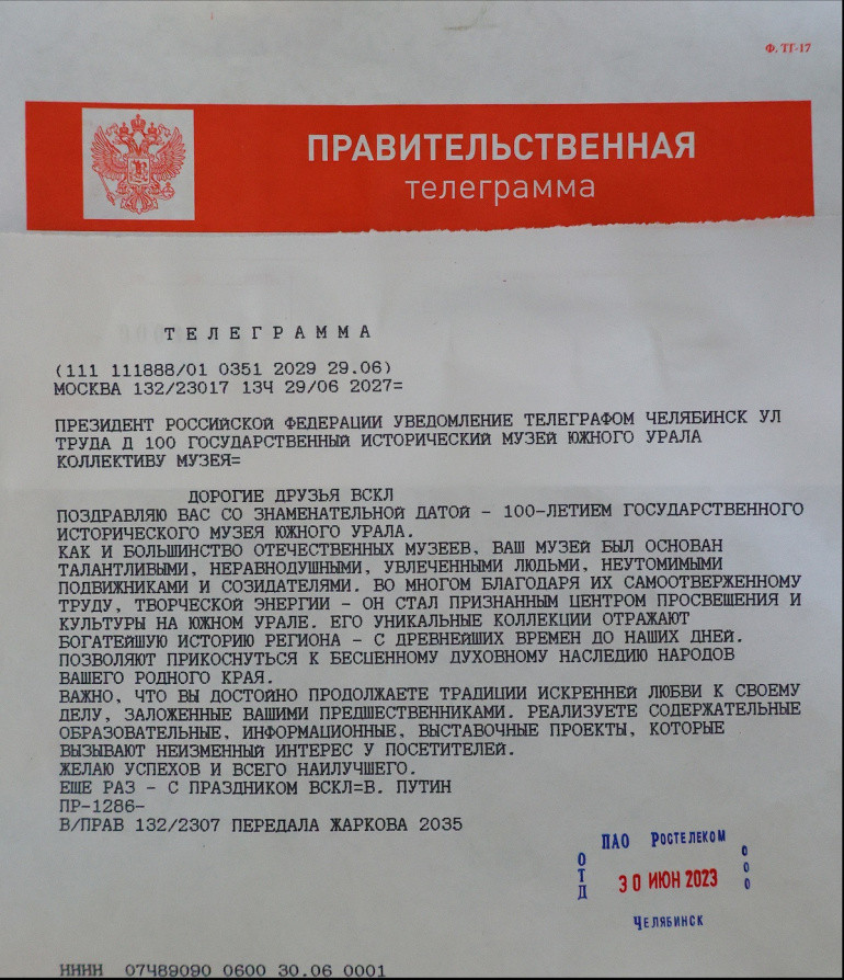 Исторический музей Южного Урала с юбилеем поздравили первые лица региона, а также президент России Владимир Путин. В Челябинск пришла правительственная телеграмма.