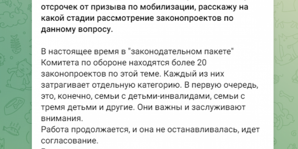 «В настоящее время в «законодательном пакете» комитета по обороне находятся более 20 законопроектов по этой теме (отсрочек от призыва по мобилизации). Каждый из них затрагивает отдельную категорию. В первую очередь, это, конечно, семьи с детьми-инвалидами, семьи с тремя детьми и другие», — написал депутат.