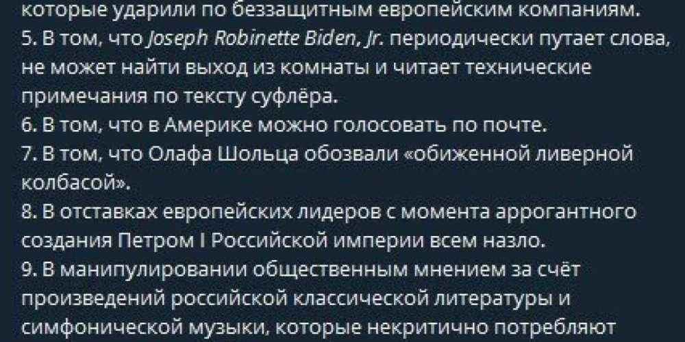 В список также вошли зашкаливающие цены в США и их ближайших союзников, высмеял Байдена и вспомнил оскорбление «обиженной ливерной колбасой»,канцлера Германии Олафа Шольца,