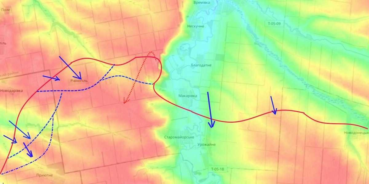 Первоочередная задача, это сбить наши части с высот, зайдя им во фланг со стороны Приютного. Далее, удар по долине на Старомлыновку, и при удачном стечении обстоятельств, быстрый прорыв единственной здесь серьезной линии обороны (а их здесь у нас не три, как под Ореховом, а одна), которая расположена южнее этой самой Старомлыновки.