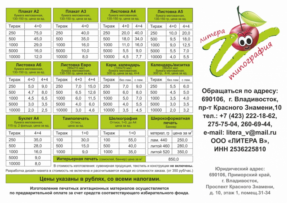 ООО “Литера В” объявляет о предоставлении услуг по изготовлению печатных агитационных материалов избирательным объединениям, политическим партиям, зарегистрированным кандидатам, их доверенным лицам, представителям политических партий, выдвинувших зарегистрированных кандидатов на: