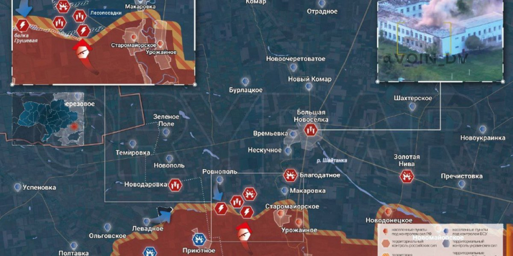В районе Времьевского выступа вчера российская авиация и артиллерия провели массированный обстрел украинских опорных пунктов в посадке северо-западнее Старомайорского.