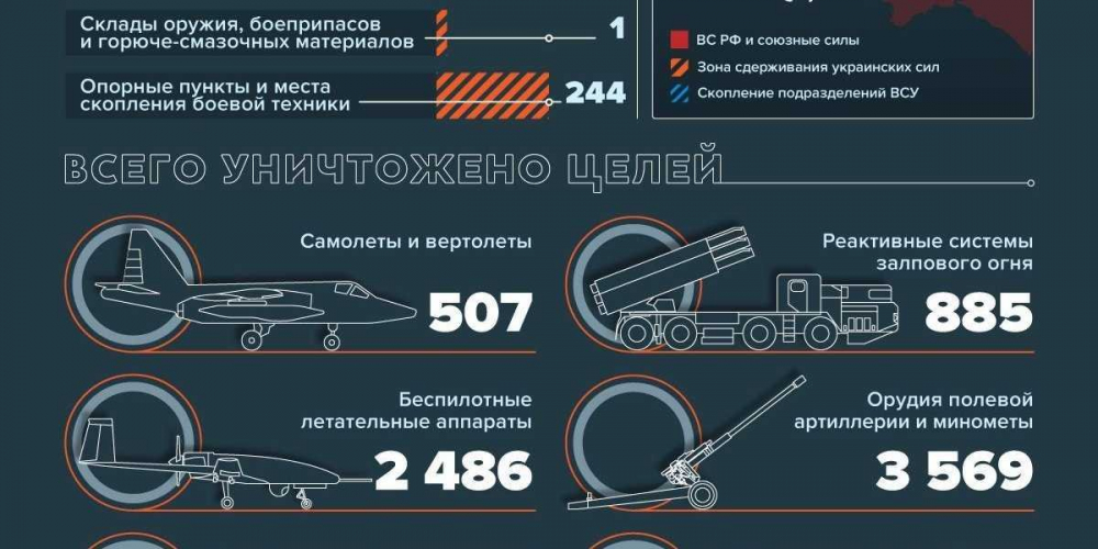 Также поражены 9 командных пунктов ВСУ, склад боеприпасов, 52 артиллерийских подразделения и 176 районов скопления живой силы и техники. В районе Золочева подавлена батарея М777, а под Невским — взвод «Акаций». Над Мировкой сбит Ми-8 ВВС Украины.