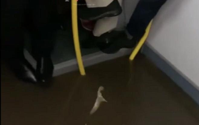 В салоне находились пассажиры, которым пришлось спасаться от воды с помощью поручней, залезая на них и сиденья с ногами, а также держась руками за верхнюю часть дверей.