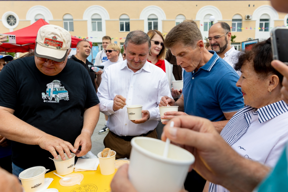 А праздник продолжался. На запах рыбацкой ухи и звуки музыки народ стекался со всего центра Владивостока. Шли целыми семьями. Угощались, общались, в том числе с губернатором. Фотографировались с ним на память.