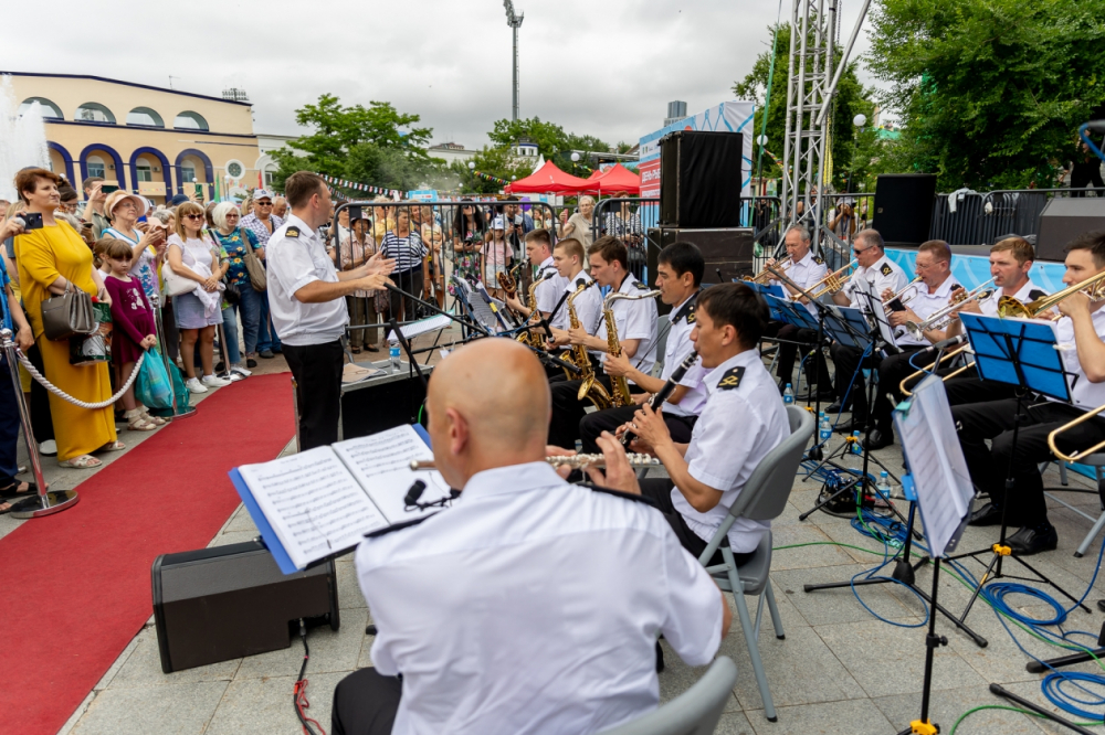 Как водится, хорошее настроение гостям праздника обеспечивали и мастера искусств. С большой радостью было принято выступление эстрадного оркестра МГУ имени адмирала Г.И. Невельского и Дальневосточного бассейнового филиала ФГУП “Росморпорт”. На сцене выступали Юлия Чайкина и Александр Ильченко с современными треками “Ягода малинка” (12+), “Кукушка” (12+), “Батарейка” (12+) и т.д.