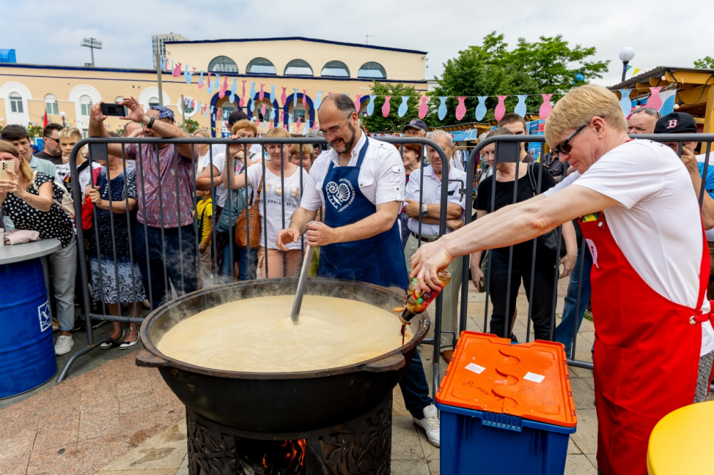 В 11.00 свои “точки” развернули такие известные в городе заведения, как “Ракушка”, “Пекарня”, “Огонёк”, “Сестры Ким”, “Токио”, “Баба Тома”, “Пянсе”. Мысленно представили на одном столе тарелки с картофелем фри с ламинарией, с устрицами с изюмом или джемом, с солянкой с кальмаром, с окрошкой на тане, с минтаем фри. И наконец — с дальневосточным пловом с морепродуктами, приготовленном в большом казане! Получилось феерично.