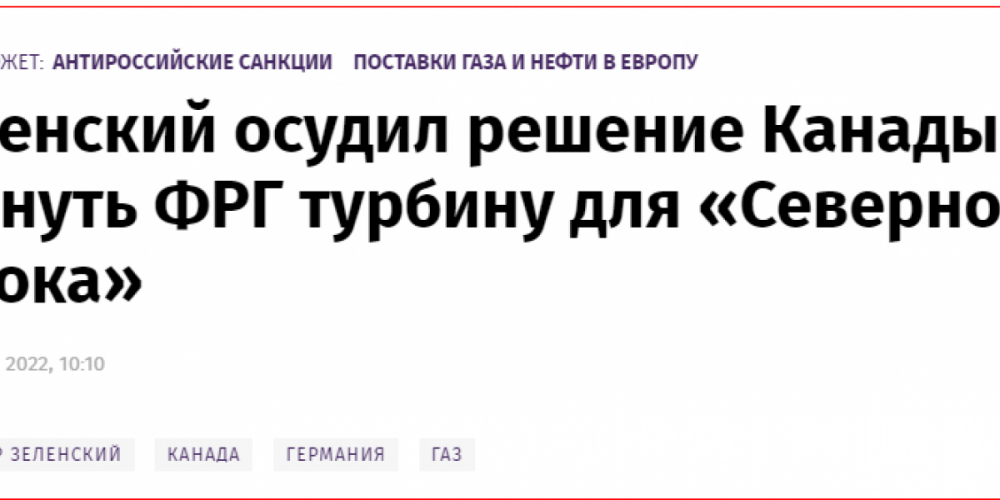 С турбиной всё в порядке, готова к установке и запуску, но Канада возвращать отказалась, так как санкции не позволяют. Ну никакого единства в решениях «коллективного Запада», не получается действовать коллективно, чтобы не мешать друг другу.