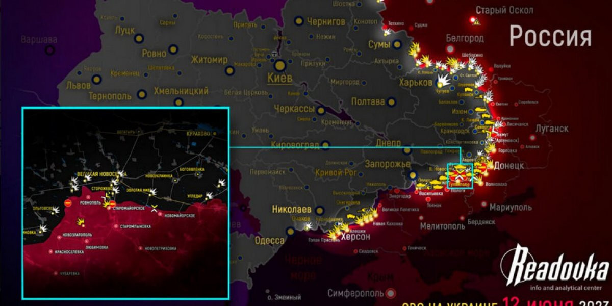Карта боевых действий на Украине с сайта Readovka (данные на 13 июня 2023).