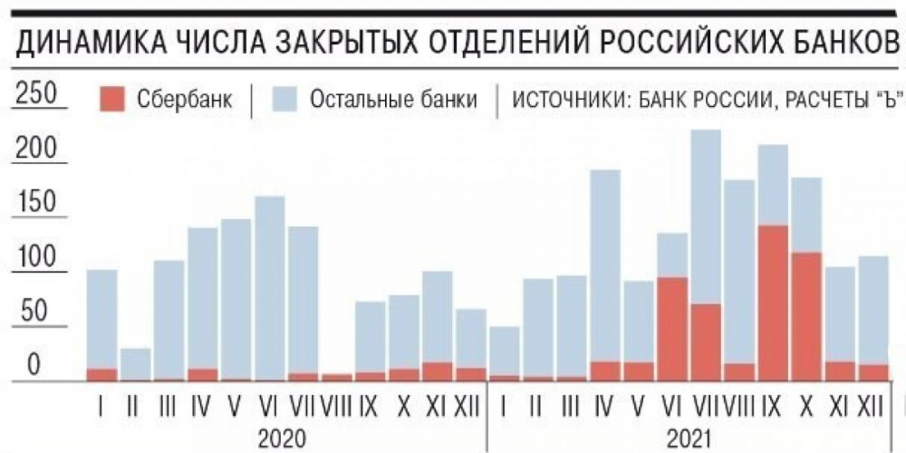 В 2021 году банками было закрыто рекордное количество офисов – 1800 по всей стране. Ускорение темпов закрытия в прошлом году было связано в том числе и с уменьшением числа самих банков, которое, по данным ЦБ, в 2021 году сократилось на 33. Однако треть всех упраздненных офисов пришлось именно на Сбербанк, который в 2021 году закрыл 524 отделения.