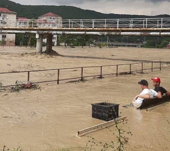 Двое мужчин в поселке Новомихайловском Туапсинского района весьма необычно вчера, 15 июля, решили провести время. Друзья сидели на лавочке на затопленном берегу реки. По всей видимости, они решили не сидеть в скуке в отеле, а решили подышать свежим воздухом и придавить лавочку, чтобы ее не смыло бурным потоком воды.
