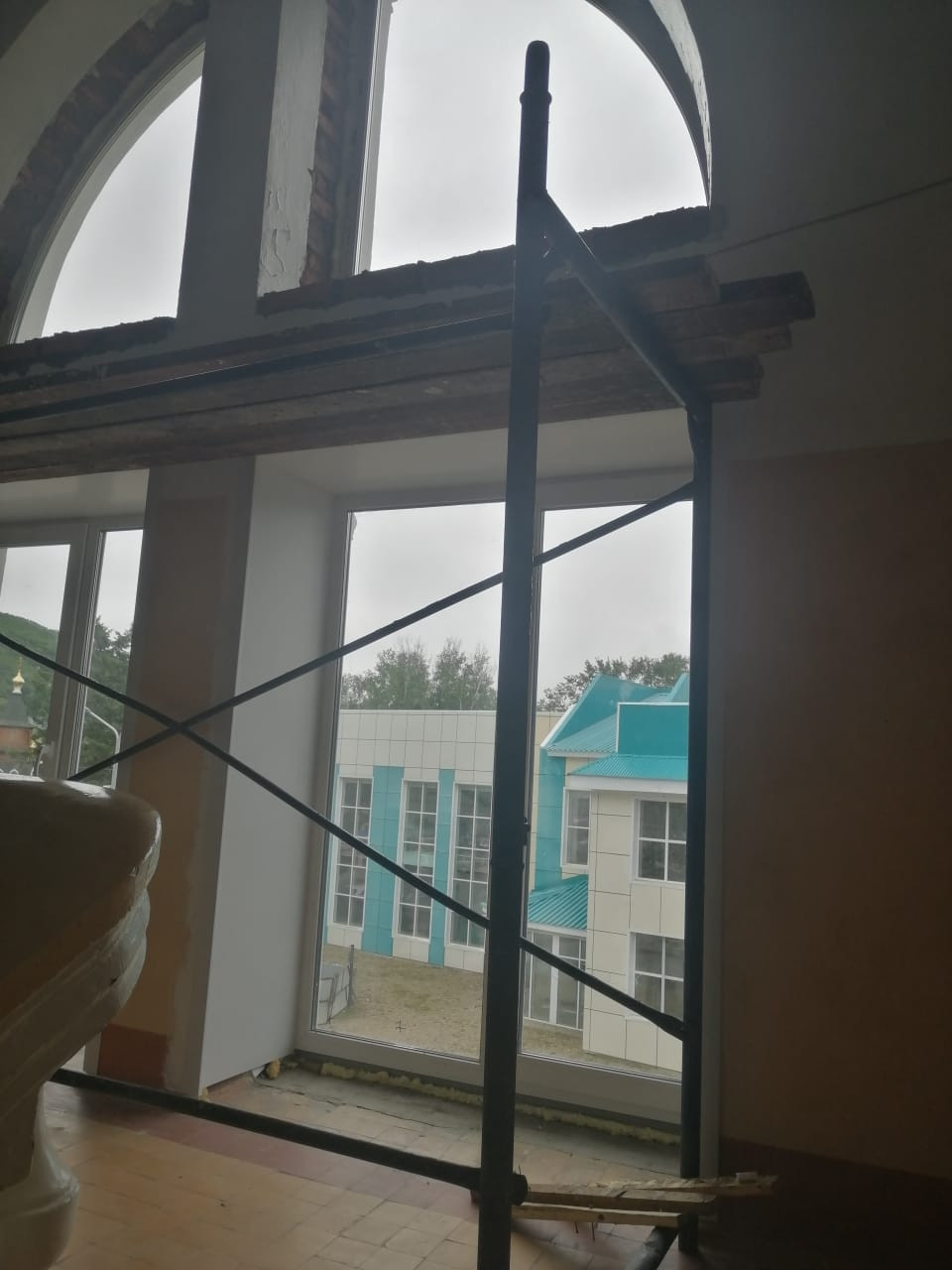 В настоящее время выполнены работы первого этапа: установлены окна на первом, втором и третьем этажах. Заканчиваются работы по установке межкомнатных и противопожарных дверей, подготовлено основание для укладки плитки в холле второго этажа.