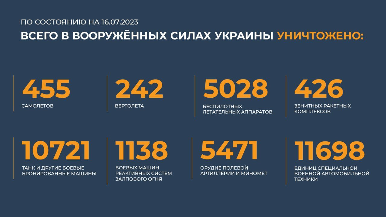 Всего с начала проведения специальной военной операции уничтожено: 455 самолетов, 242 вертолета, 5028 беспилотных летательных аппаратов, 426 зенитных ракетных комплексов, 10721 танк и других боевых бронированных машин, 1138 боевых машин реактивных систем залпового огня, 5471 орудие полевой артиллерии и миномет, а также 11698 единиц специальной военной автомобильной техники.