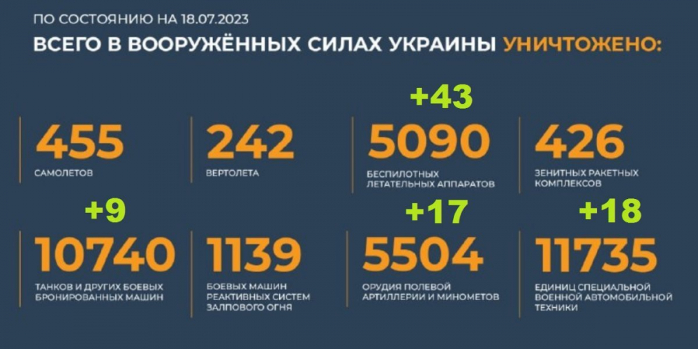 Потери Украины на сегодня 18.07.2023 Всего с начала проведения специальной военной операции уничтожены: 455 самолетов, 242 вертолета, 5090 беспилотных летательных аппаратов, 426 зенитных ракетных комплексов, 10740 танков и других боевых бронированных машин, 1139 боевых машин реактивных систем залпового огня, 5504 орудия полевой артиллерии и минометов, а также 11735 единиц специальной военной автомобильной техники.