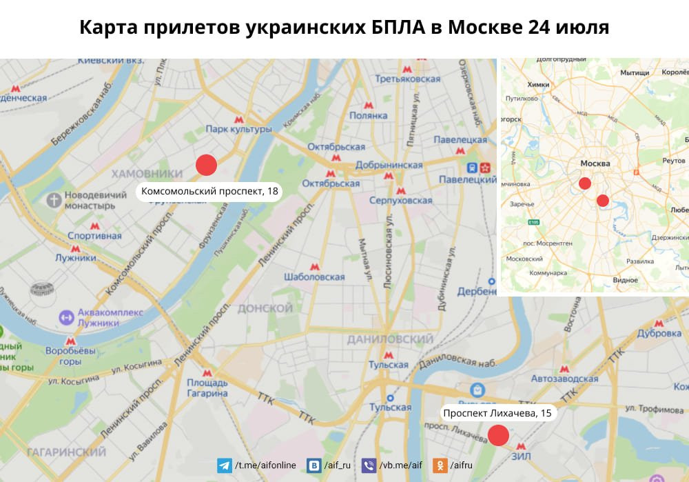 Карта прилетов БПЛА в Москве сегодня, 24 июля 2023 года