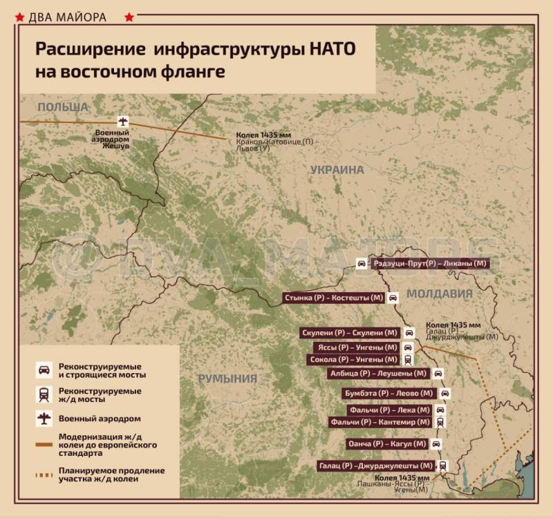 Так, в Румынии анонсированы планы строительства полотна европейского стандарта (1435 мм) на участках Пашканы - Яссы - Угены и Галац - Джурджулешты. Далее эти пути продлят до Кишинева и Одесской области, что позволит оперативно поставлять западные вооружения на территорию Украины.