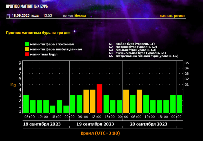 Как уже было указано выше, магнитная буря прогнозируется 19 сентября. Всплеск до уровня G1 (слабая) ожидается после полудня. С 06:00 магнитосфера планеты будет в возбужденном состоянии.