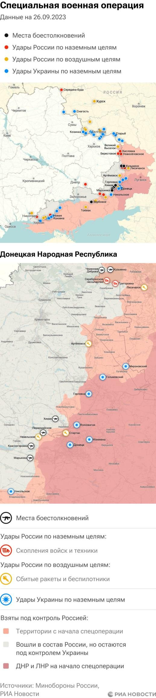 Опубликованная накануне РИА Новости карта боевых действий на Украине не потеряла своей актуальности сегодня, 27.09.2023. На ней отражены основные районы, где сейчас ведутся бои.