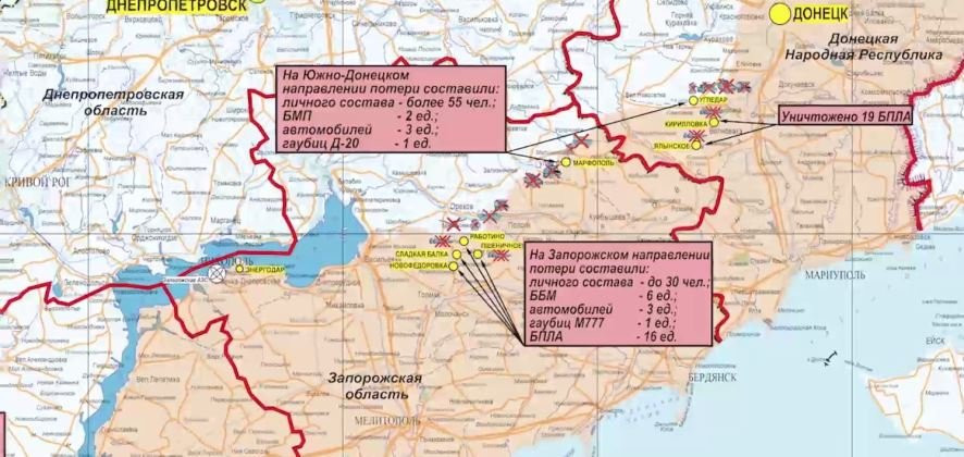 Внушительные потери украинской армии за сутки отмечены на Донецком направлении. Подразделения "Южной" группировки войск поразили целый ряд военных объектов, что привело к гибели порядка 235 украинских военнослужащих. Также были уничтожены две боевые бронированные машины и шесть автомобилей. Активные боевые действия были зафиксированы в районах следующих населенных пунктов: Красное, Васюковка, Раздоловка и Клещеевка Донецкой Народной Республики.