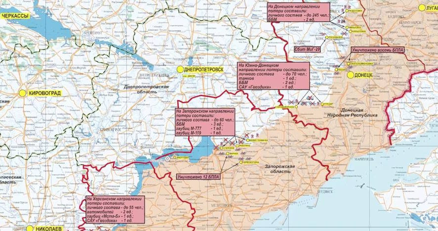 На Запорожском направлении отражены три атаки ВСУ в районах Работино и Новопрокоповки, украинские потери - до 80 человек, три танка, 5 БМП, на Херсонском направлении уничтожено до 30 украинских военных.