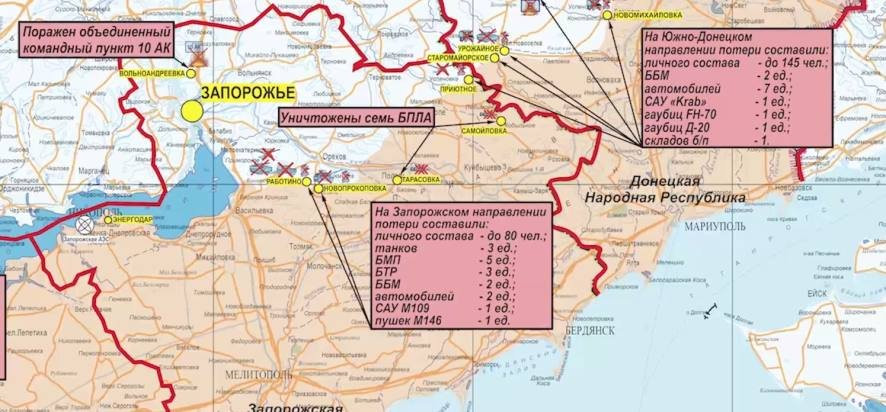 Все за истекшие сутки были нанесены огневые поражения в 118 районах, где украинские войска потеряли множество живой силы и военной техники. Средства противовоздушной обороны (ПВО) были сбиты семь ракет РСЗО "Хаймарс", а также уничтожены 38 беспилотников.