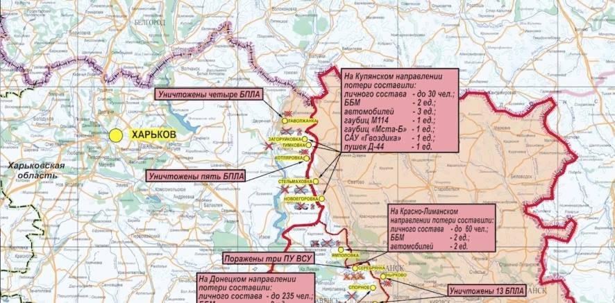 На Купянском направлении продолжается продвижение российских войск. Одновременно с этим Вооруженные силы Российской Федерации (ВС РФ) за минувшие сутки были отражены три украинских атаки. В результате этого потери Вооруженных сил Украины (ВСУ) составили до 25 человек.