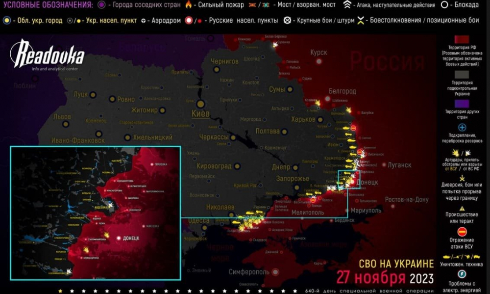 Опубликованная накануне изданием Readovka карта боевых действий остаётся актуальной по состоянию на утро сегодняшнего дня, 28 ноября 2023 года.