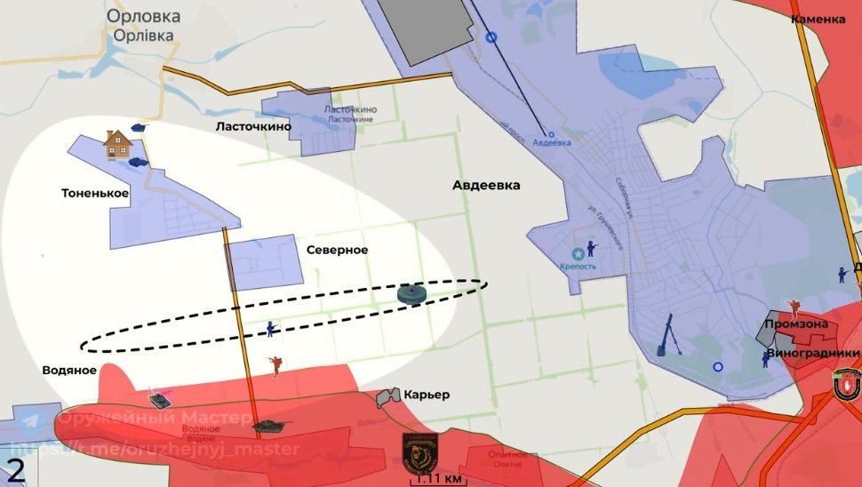 Северо-западнее Авдеевки российские подразделения продвинулись к югу от населенного пункта Степовое, ещё больше сократив полосу снабжения группировки ВСУ. В настоящий момент расстояние по прямой между позициями ВС России западнее и северо-западнее Авдеевки составляет всего 5,5 километров.