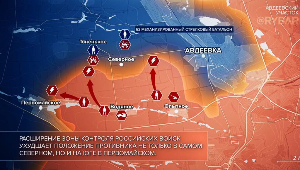 Также сообщается, что произошло продвижение российских войск вдоль лесопосадки вглубь до 600 метров юго-восточнее села Степное. Идут бои рядом с насосной станцией и частным сектором Авдеевки. Там наши бойцы концентрируют силы в промышленной зоне для дальнейших атак.